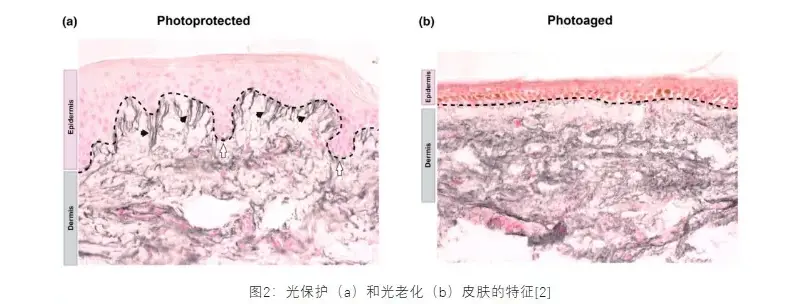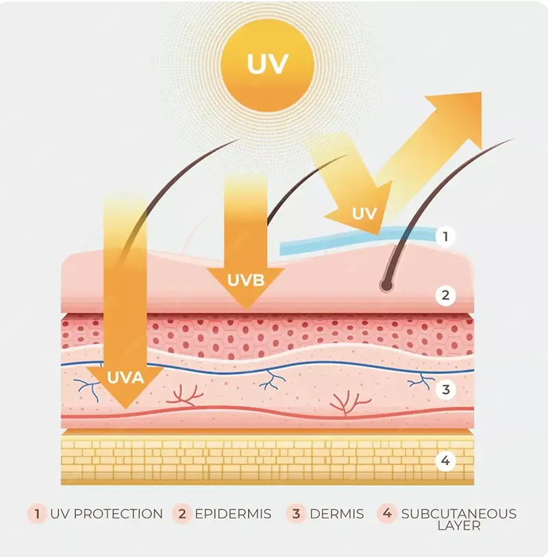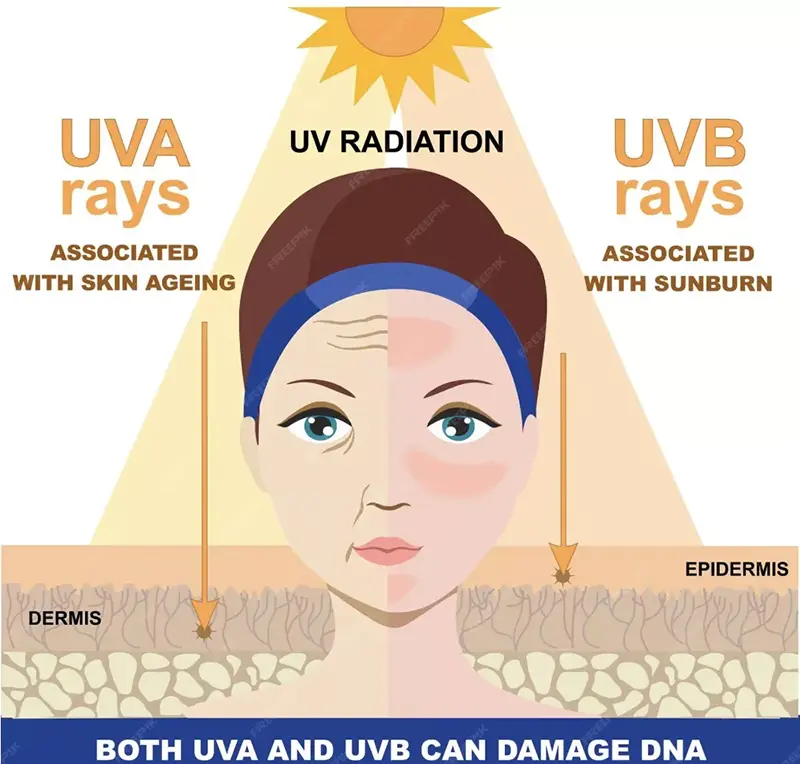 UVA と UVB はどちらも皮膚にダメージを与える可能性がありますが、その影響は主に浸透深さによって異なります。明らかに、より豊富な UVA は真皮のより深くまで浸透する可能性があり、光老化により直接的に関係しています。なぜなら、UVA は ROS を生成し、コラーゲンやエラスチンを分解し、しわ、皮膚の弾力性の喪失、その他の早期老化の兆候を引き起こすからです。対照的に、UVB は主に表皮に影響を与え、短期的には日焼け (日光紅斑) やメラニン生成を引き起こしますが、長期間の曝露は角質増殖を引き起こし、皮膚悪性腫瘍のリスクを大幅に高める可能性があります。