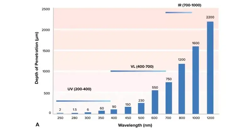 上図に示すように、可視光線は皮膚への浸透深さが深いため、皮膚への影響が大きくなります。赤色光は表皮と真皮を透過し、脂肪層に到達することができ、波長と透過深さの関係、および波長とエネルギーの逆関係を示していますが、青色光は赤色光よりもエネルギーが高く、透過深さが浅くなっています。